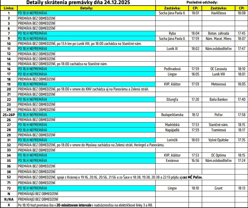 - školské linky a školské spoje nebudú premávať, rovnako tak ani spoje pre Technickú univerzitu na linke R4,