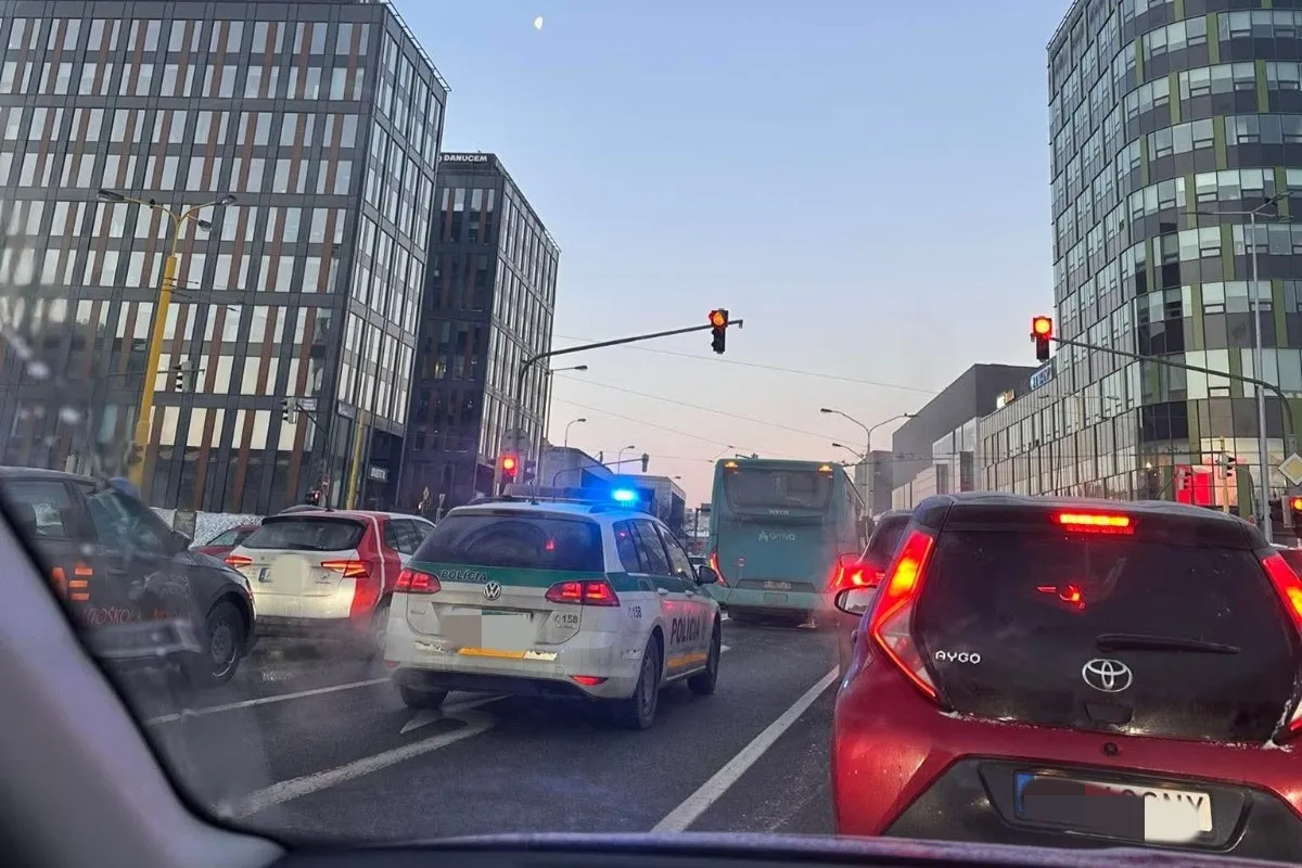 Pozor si dávajte aj na pokazený autobus v pravom odbočovacom pruhu na križovatke pri Auparku smerom na Jantárovú.