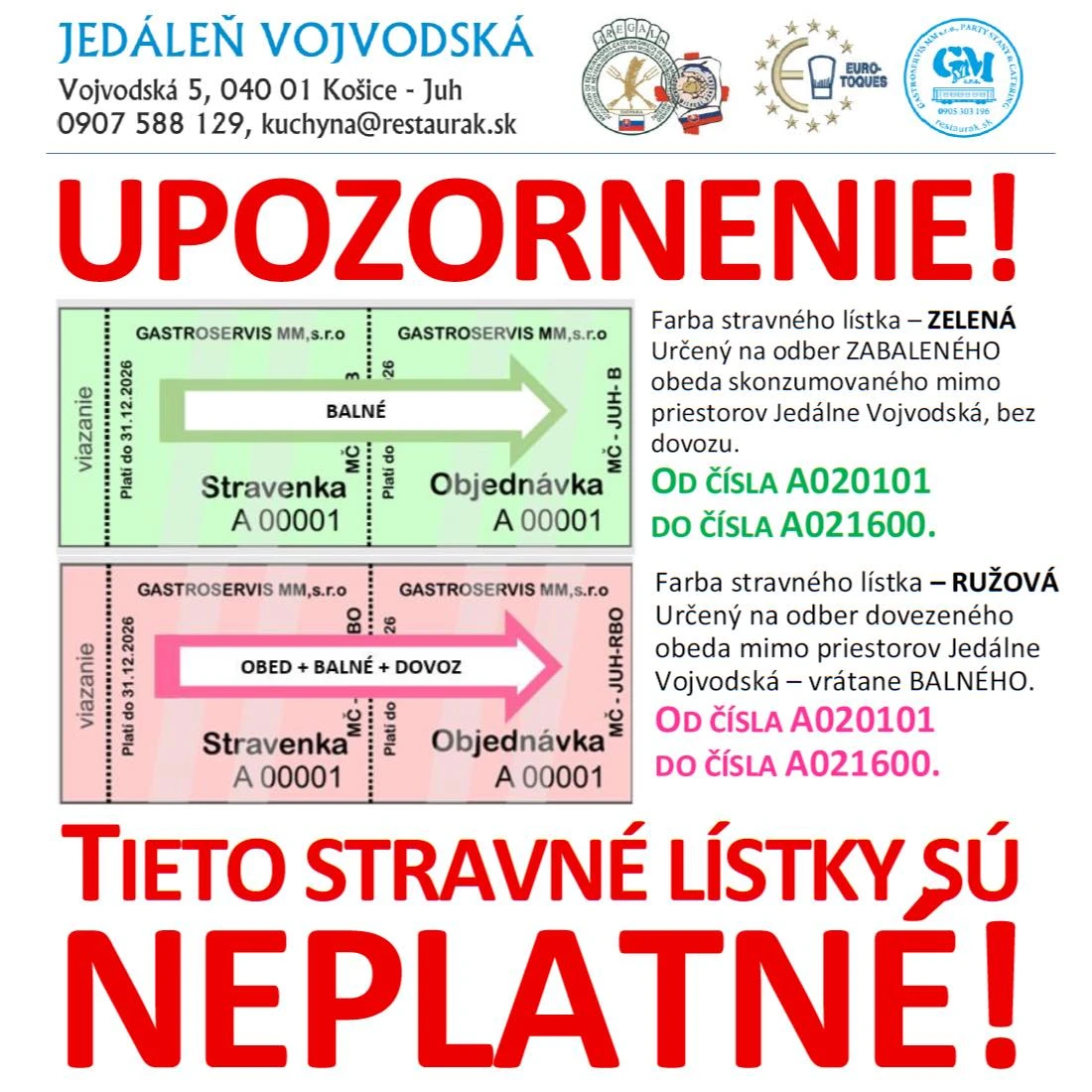 Klienti si v Jedálni Vojvodská štandardne vymieňajú obedové menu za stravné lístky, no práve v tomto prípade môže nastať vážny problém. Do obehu sa totiž dostali neplatné stravné lístky, ktoré vznikli následkom trestnej činnosti. Prevádzka upozorňuje, že ak sa niekto pokúsi takéto lístky použiť pri objednávke stravy, bude okamžite privolaná polícia – a jedlo za ne, žiaľ, nebude možné vydať. Jedáleň zároveň vyzýva verejnosť, aby v prípade, že im niekto lístky ponúka na predaj, odmietli ich a situáciu nahlásili polícii alebo priamo prevádzke.