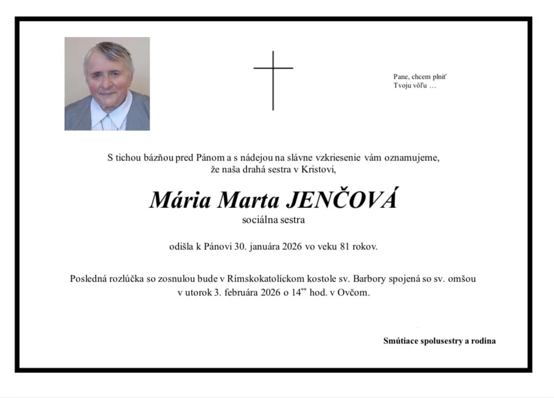 „S tichou bázňou pred Pánom a s nádejou na slávne vzkriesenie vám oznamujeme, že naša drahá sestra v Kristovi, sociálna sestra Mária Marta Jenčová, odišla k Pánovi v piatok 30. januára vo veku 81 rokov,“ oznámila komunita. Zosnulá bola dlhoročnou členkou košickej komunity, kde ju poznali ako oddanú spolusestru a ženu hlbokej viery.