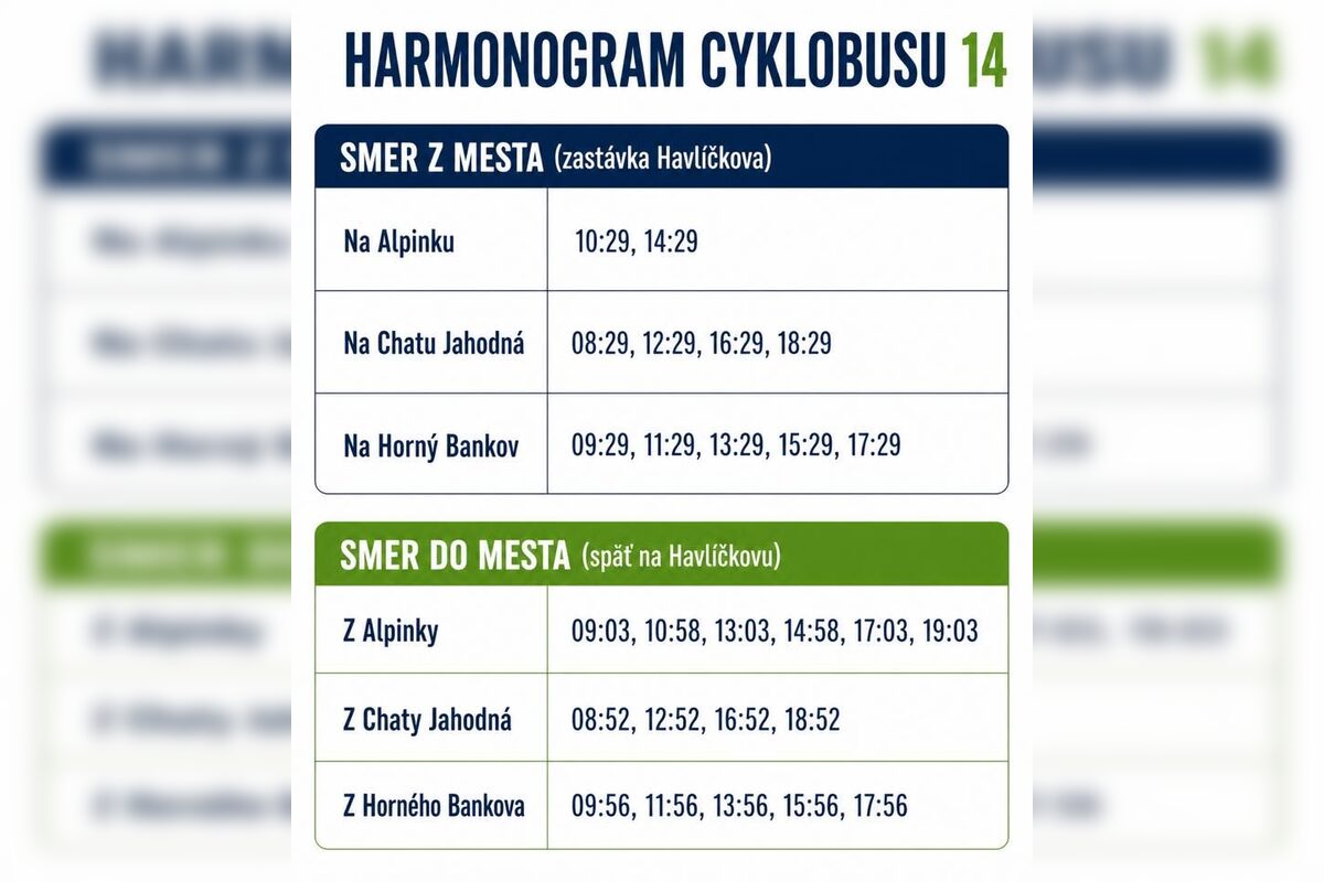 Cyklobus na autobusovej linke číslo 14 bude premávať vždy počas víkendov a sviatkov, a to vo vybraných časoch od 08:29 do 19:03 hod. Jeho trasa povedie cez nástupné a výstupné zastávky Havlíčkova – Čermeľ – Alpinka – Horný Bankov – Chata Jahodná a späť. Sezóna cyklobusu potrvá až do konca októbra.