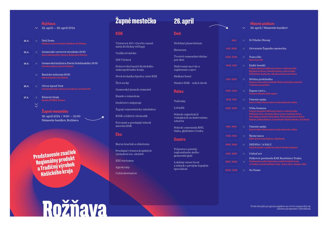 Kto má Rožňavu ďaleko, nemusí zúfať. Počas najbližších týždňov župné dni zavítajú aj do ďalších regiónov - Spiš 29. 4. - 3. 5. 2024, Zemplín 6. - 10. 5. 224, Abov 14. 5. - 17. 5. 2024.