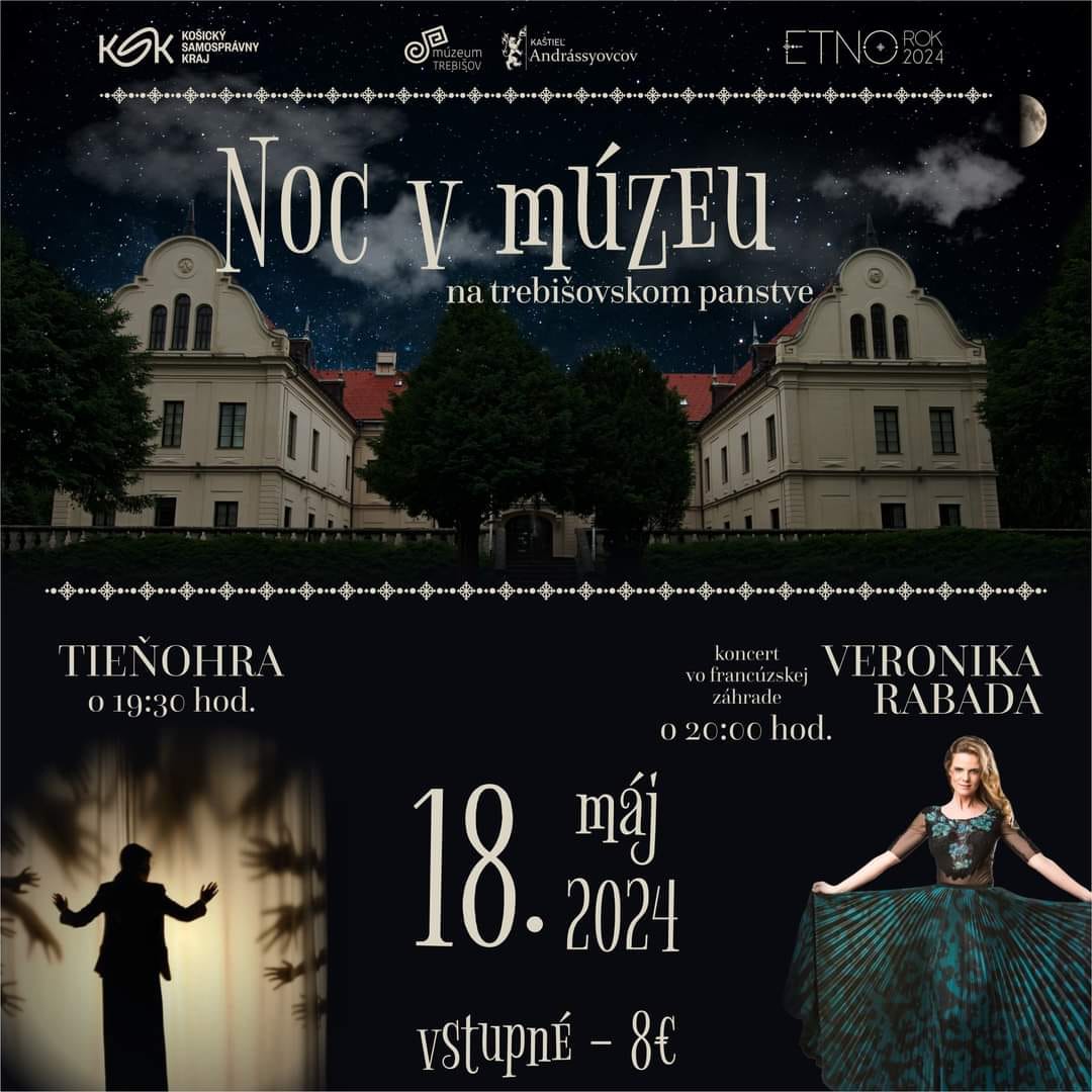 Noc v múzeu vypukne o 19:30 hod. na Nádvorí trebišovského kaštieľa. Návštevníkom vyrozpráva tieňohra príbeh mladého dievčaťa, ktoré odišlo pracovať do grófskej kuchyne Andrássyovcov na trebišovskom panstve. Po nej bude nasledovať koncert Veroniky Rabady vo francúzskej záhrade za kaštieľom. V prípade nepriaznivého počasia sa koncert presunie do priestorov jazdiarne.