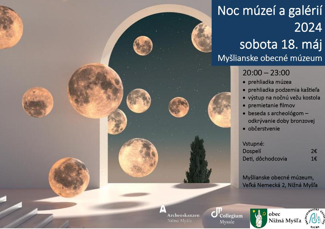 Na večerný program pozýva aj Myšlianske obecné múzeum, kde sa trojhodinový program začne o 20:00 hod. Návštevníci budú môcť absolvovať prehliadku múzea, podzemia kaštieľa či vystúpiť na nočnú vežu kostola. V rámci akcie sa budú premietať filmy, prebehne obohacujúca beseda s archeológom, ktorý odkryje tajomstvá doby bronzovej a nebude chýbať ani občerstvenie. Vstupné pre dospelých je stanovené na dve eurá, deti majú vstup za polovicu.