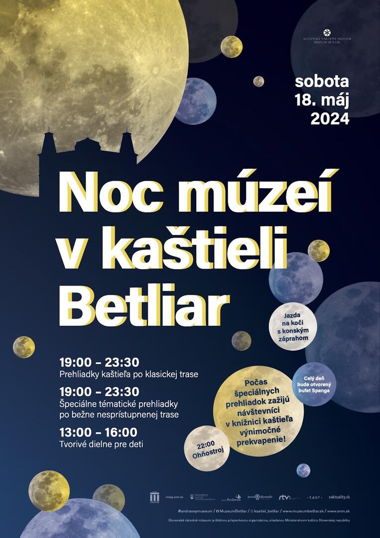 Azda sa nenájde nikto, kto by ešte nenavštívil kaštieľ v Betliari. Ale určite sa nájdu takí, ktorí ho nezažili pod rúškom noci. V sobotu večer to môžete zmeniť. Pre návštevníkov budú pripravené dve prehliadkové trasy, ktoré potrvajú až do 23:30 hod. Pre deti sú pripravené od poludnia tvorivé dielne, okolo kaštieľa sa počas dňa bude premávať historický koč, na ktorom sa môžete previezť aj vy. Večer vyvrcholí ohňostrojom o 22:00 hod. Vstupné pre dospelých je 15 eur, deti 12 eur.