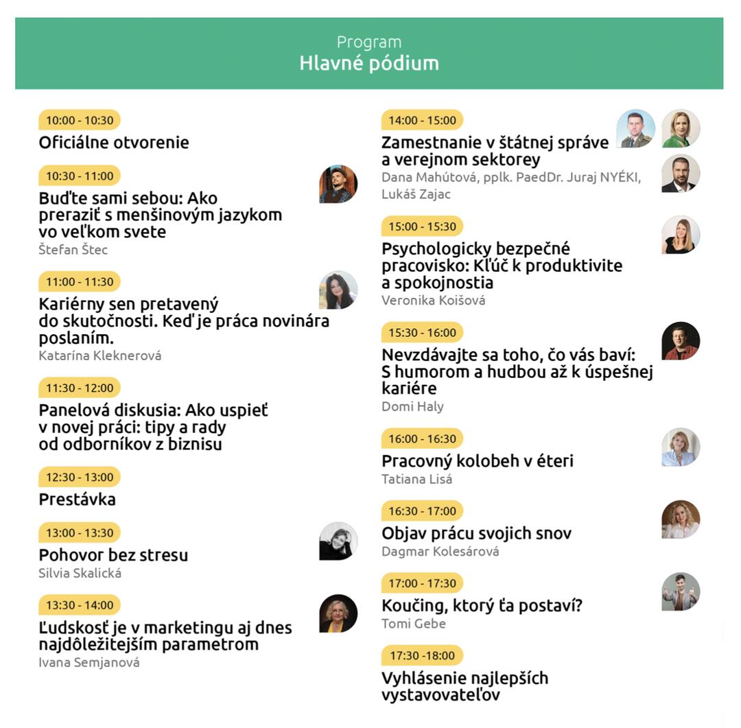 Nezabudnite si so sebou zobrať aj svoj životopis, ktorým zaujmete potenciálnych zamestnávateľov. Ak si s ním však neviete rady, na mieste si ho môžete nechať prekonzultovať, prípadne zhotoviť profesionálnu fotografiu. Na pódiu sa počas celého dňa vystrieda množstvo odborníkov z viacerých oblastí, ale nebude chýbať ani kultúrna vložka od Štefana Šteca či humor komika menom Domi Haly.