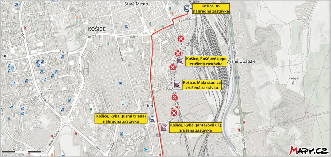 „Cestujúcim odporúčame využiť na nástup a výstup počas rekonštrukcie zastávky Košice, AS (autobusová stanica) a Košice, Ryba - spoje smerujúce do mesta budú zastavovať na nástupišti zastávky na Južnej triede (pred SOŠ Policajného zboru). Nástupište zastávky Košice, Ryba na Južnej triede v smere von z mesta bude obsluhované bez zmeny," uviedol dopravca.