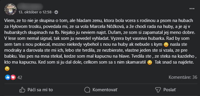 Muž sa rozhodol prehovoriť na Facebooku a podeliť sa so svojou neobyčajnou skúsenosťou z lesa. Ako sám píše, stretol rodinu so psom a započul meno Marcela. Keďže signál v lese je vzácnosť, nemal možnosť si vymeniť kontakty, no z opisu je zrejmé, že stretnutie s touto ženou bolo výnimočné. Marcela bola zapálená hubárka, ktorá počas stretnutia mužovi darovala „modráky" (Hríbnik siný), čo len pridalo celej situácii na jedinečnosti.