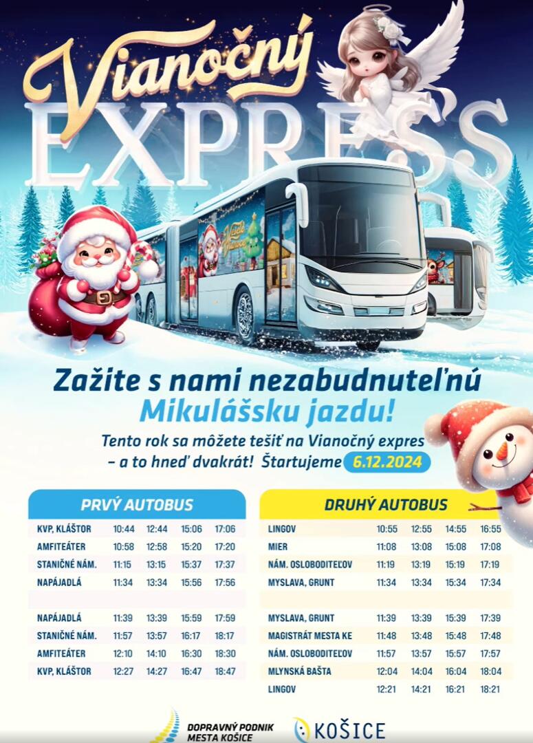 V piatok 6. decembra, presne na Mikuláša, budú posádku autobusu tvoriť nielen cestujúci a vodič, ale aj vianočné a rozprávkové postavy. Linka 72 (vozidlo číslo 4716) vyrazí na cesty ako Vianočný expres, pričom spoločnosť cestujúcim bude robiť Mikuláš, anjel, čert, Shrek a Fiona. A ak sa ním nestihnete odviezť tento týždeň, nemusíte zúfať. Vianočný autobus bude jazdiť po Košiciach až do 6. januára, samozrejme, ak mu to tolerantní cestujúci umožnia.