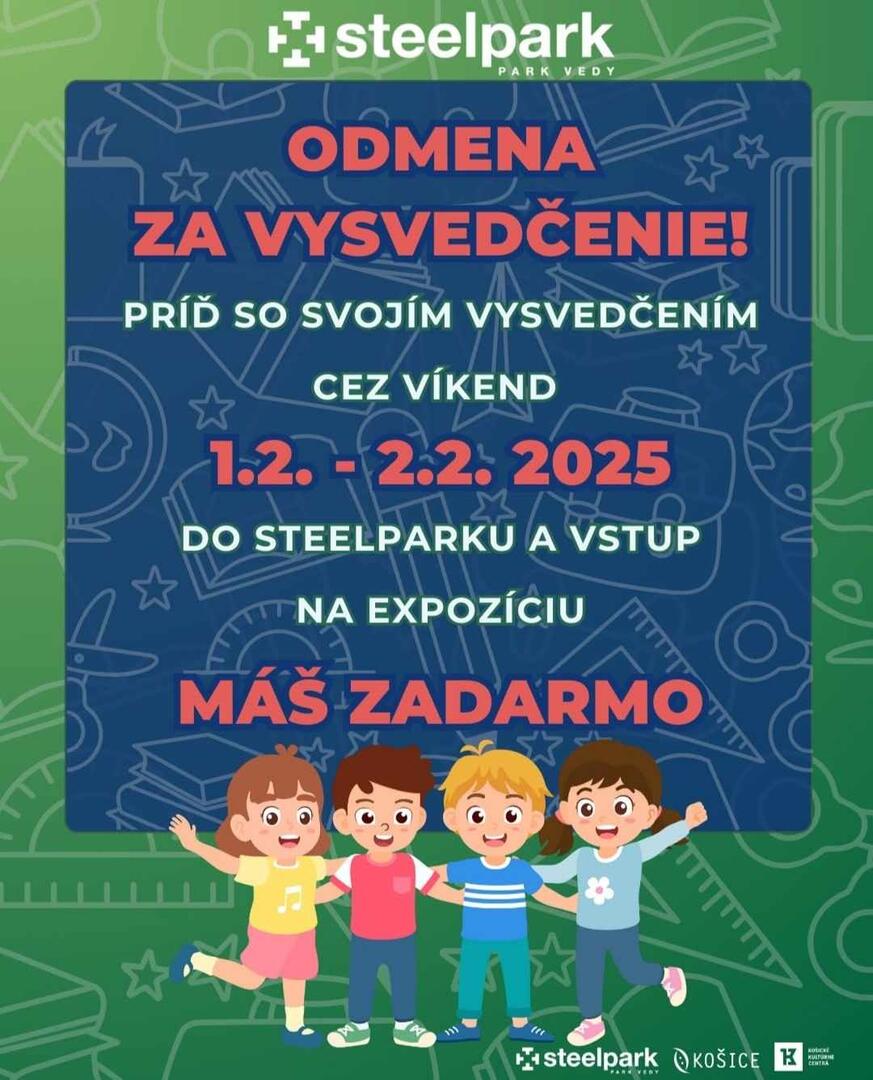 O zábavný program spojený s edukáciou sa postará aj košický SteelPark. Všetky deti, ktoré ukážu pri vstupe svoje polročné hodnotenie, dostanú vstup zdarma do vedeckého komplexu. „Tak čo, skúsite sa vyšplhať na poschodie vlastnou silou? Preskáčete sa do stredu Zeme, alebo oklamete gravitáciu? Príďte si spoločne s vašimi školákmi po odpovede a prežite deň s hravou vedou,“ znie v pozvánke.