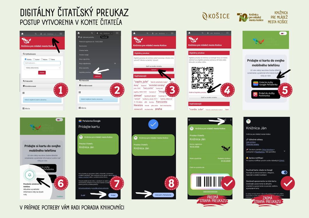 „Knižnica pre mládež mesta Košice spúšťa do používania digitálny čitateľsky preukaz. Bonusom má byť aj jeho ekologickosť. Vytvorenie je pre čitateľov bezplatné v knižnično-informačnom systéme Tritius v module e-výpožičky,“ uvádza na mesto Košice. Táto nová forma preukaz do knižnice je smart riešenie pre moderných čitateľov, ktoré pomáha šetriť priestor a zároveň efektívne spravovať výpožičky. Ide o online aplikáciu, ktorá ponúkne vyšší komfort používania čitateľského preukazu. Tento preukaz si nikdy nezabudnete, pretože ho budete mať stále pri sebe.