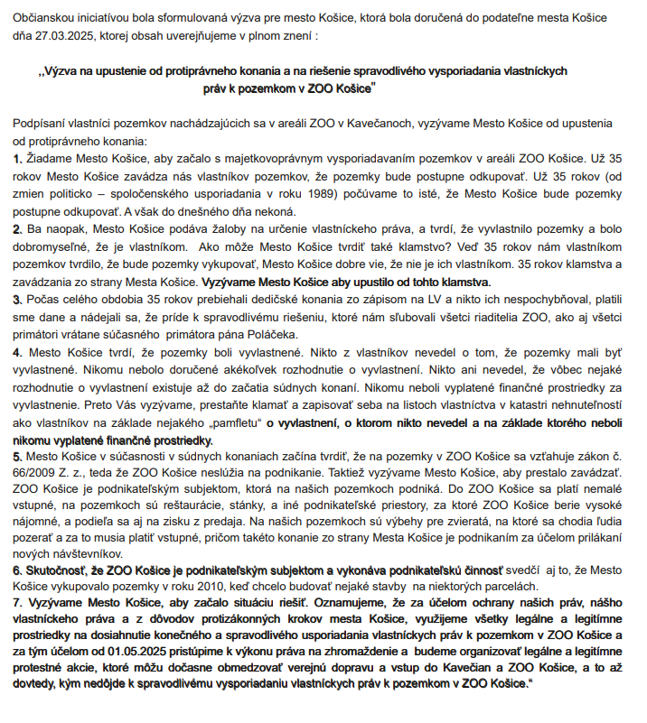 Na programe je tak ďalšie spoločné stretnutie zástupcov mesta a vlastníkov pozemkov pod košickou zoo, na ktorom by mala prebehnúť diskusia o možnostiach prenájmu či odkúpenia pozemkov. Kavečanci očakávajú konkrétny plán, ktorý by viedol k spravodlivému a postupnému vysporiadaniu sporných pozemkov. Článok budeme aktualizovať o závery z rokovania.