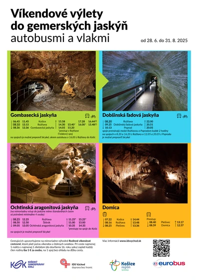 Tieto výnimočné autobusové spoje budú premávať z Košíc, Moldavy nad Bodvou, Turne nad Bodvou a Rožňavy. Spoznať tak môžete štyri gemerské jaskyne - Gombaseckú, Dobšinskú ľadovú, Ochtinskú aragonitovú a Domica.
