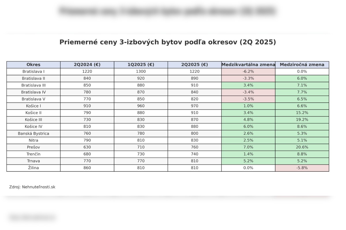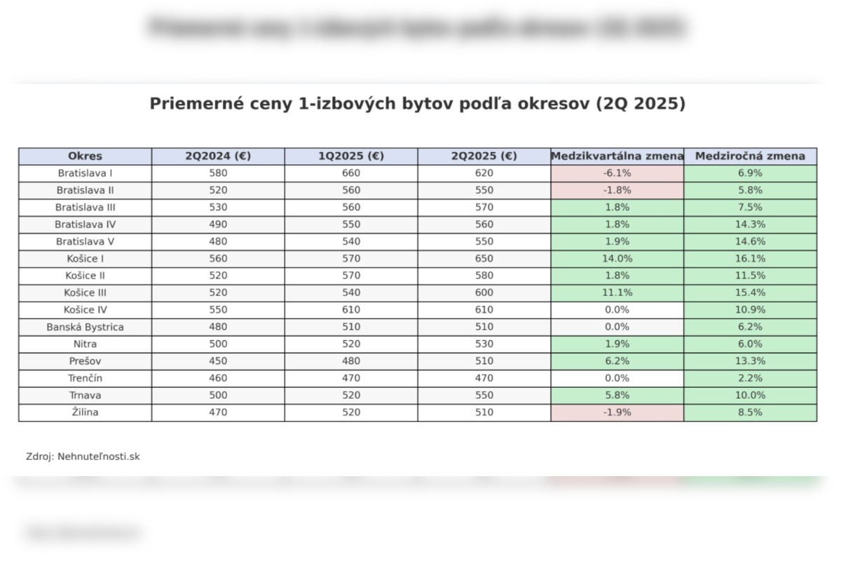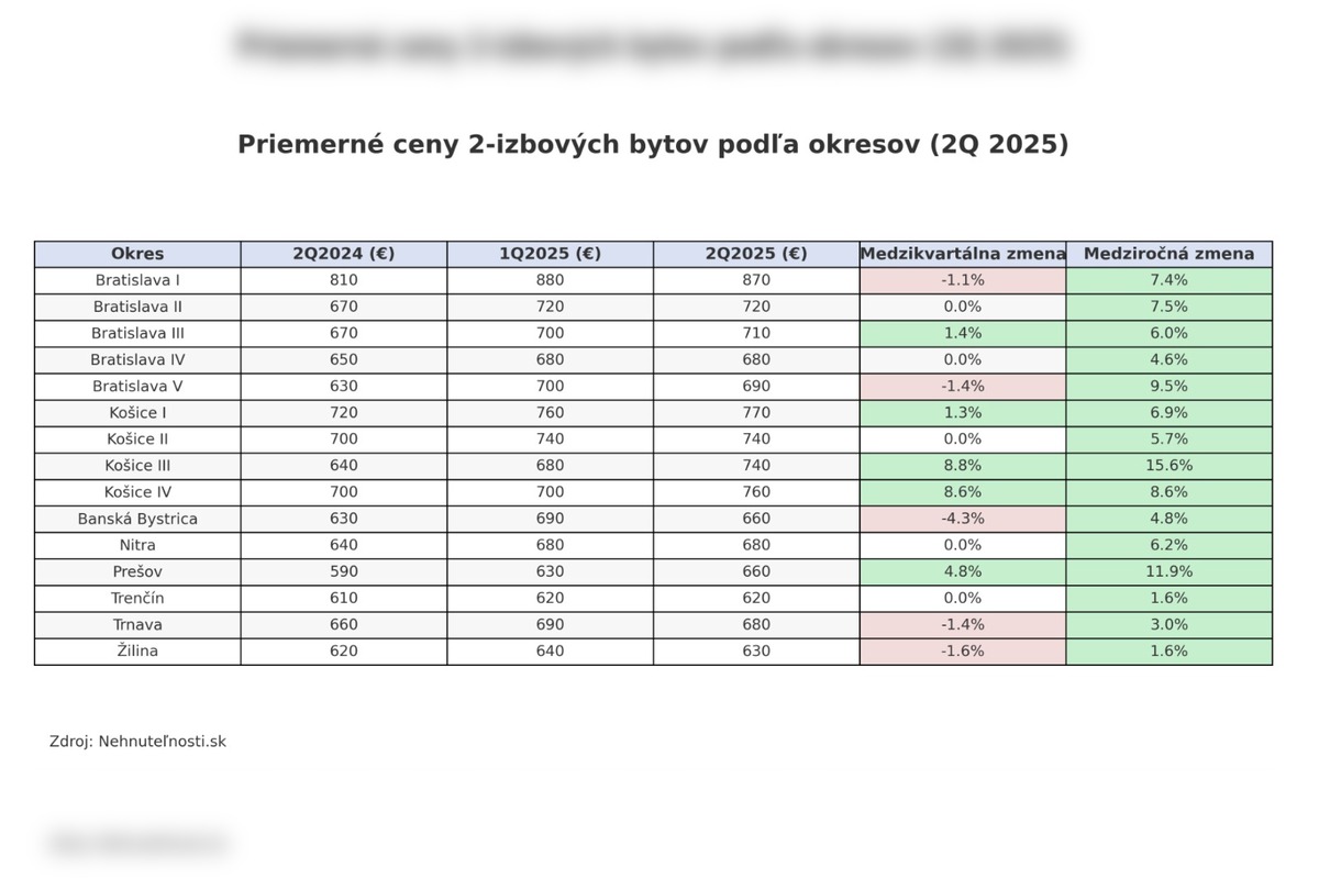 Výrazné rozdiely sa ukázali aj pri dvojizbových bytoch. Najviac rástli ceny v Košiciach III (+8,8 %), Košiciach IV (+8,6 %) a v Prešove (+4,8 %). Bratislava v tomto smere stagnovala – v niektorých častiach sa ceny medziročne pohli len o pár percent, v iných dokonca mierne klesli, zatiaľ čo Košice dominujú aj v medziročnom porovnaní.