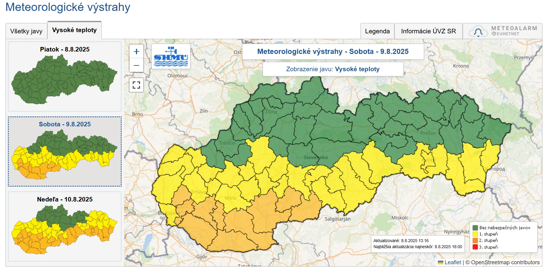 V sobotu bude najteplejšie na juhovýchode, teda v okresoch Rožňava, Košice okolie, Košice, Michalovce, Trebišov a Sobrance. V týchto oblastiach sa môžu teploty vyšplhať až na 33 stupňov Celzia. Teplotné maximá možno očakávať medzi 14:00 a 18:00 hod.