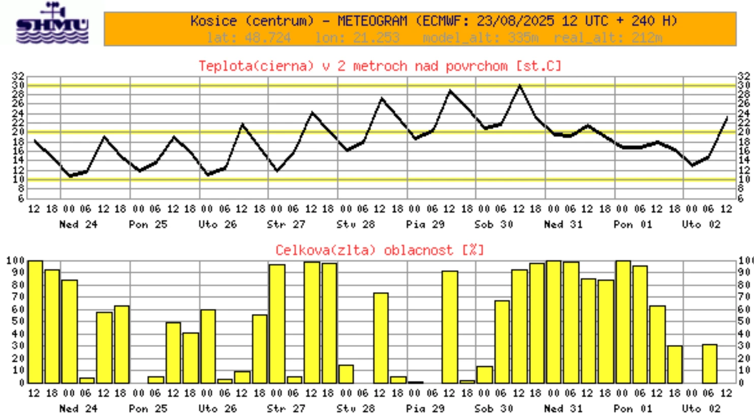 Zatiaľ čo začiatok týždňa ešte prinesie len mierne oteplenie, od utorka by sa maximálne denné teploty mali dostať nad 25 °C. Podľa meteogramu SHMÚ bude v Košiciach a okolí najteplejší piatok a sobota, kedy teplota dosiahne viac ako 30 °C.