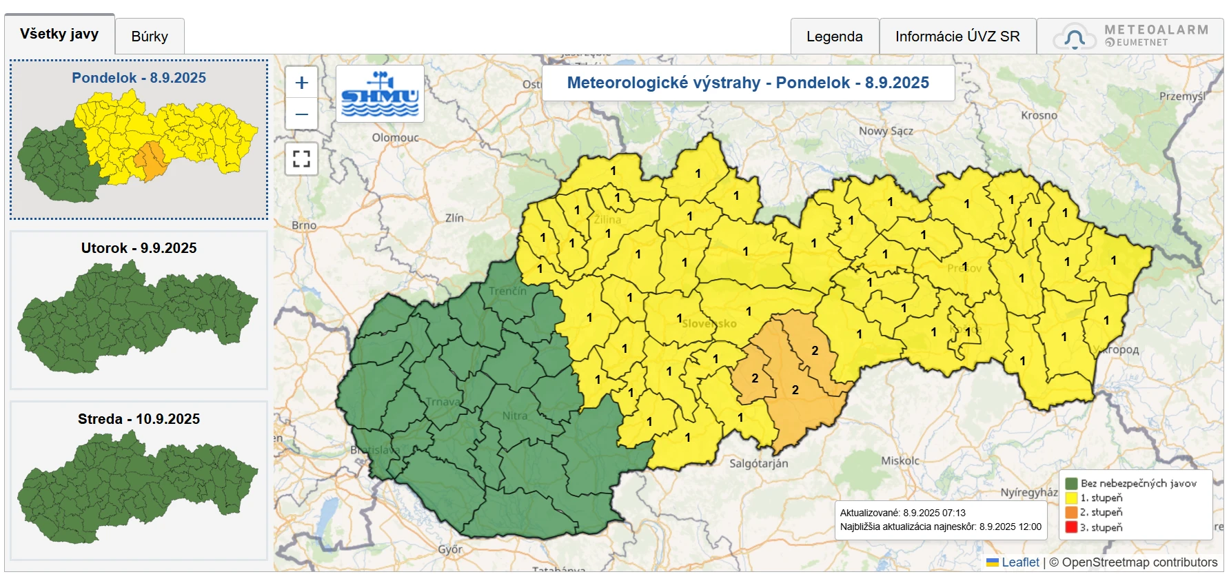 Pred búrkami varuje aj Slovenský hydrometeorologický ústav, ktorý vydal výstrahy prvého stupňa pred búrkami od 12:00 do 23:00 hod. pre všetky okresy Košického kraja.