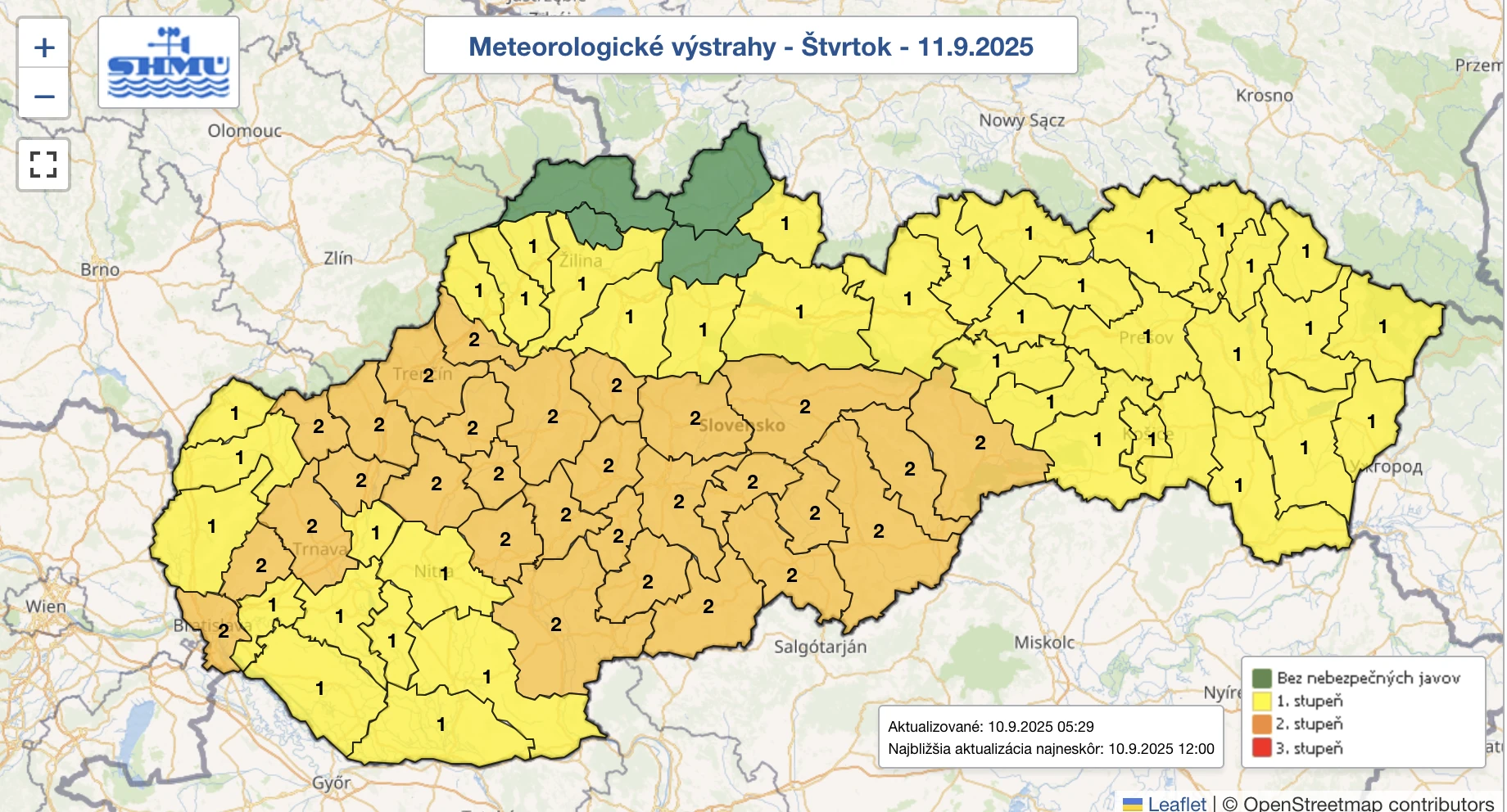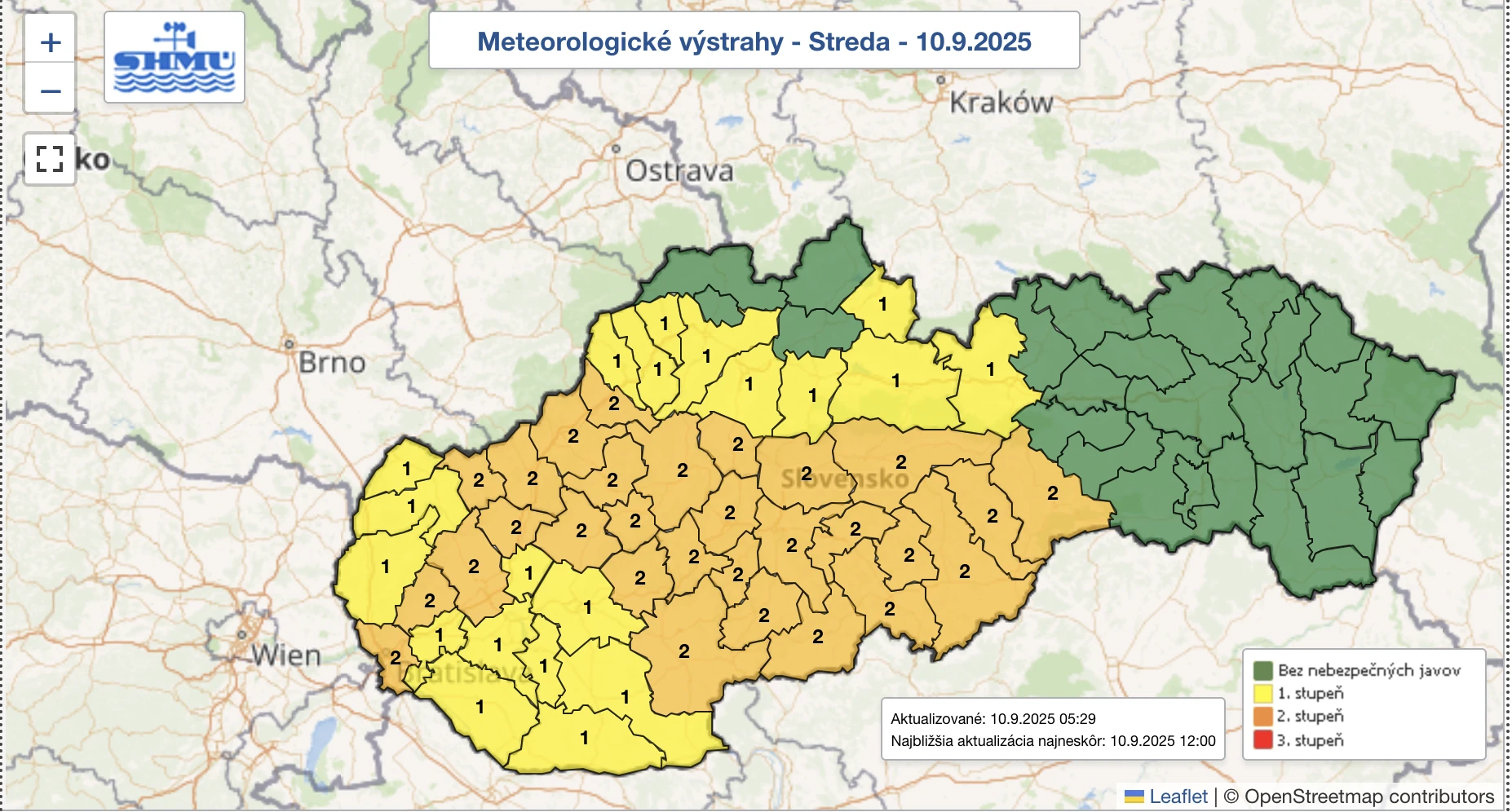 S podobným počasím treba počítať aj v nasledujúci deň. Vo štvrtok zasiahne dážď už celé územie Košického kraja. Výstrahy prvého stupňa budú platiť pre okresy Košice, Košice – okolie, Michalovce, Trebišov, Michalovce, Sobrance, Gelnica a Spišská Nová Ves. Pre Rožňavu platia aj v tento deň výstrahy druhého stupňa.