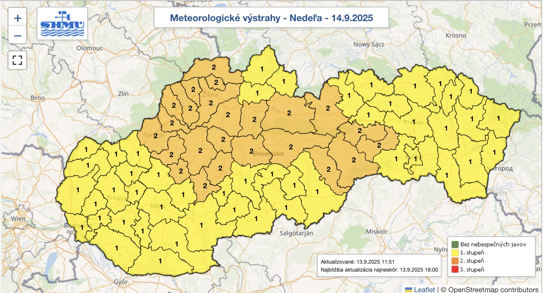 V okresoch Gelnica, Spišská Nová Ves a Rožňava platia výstrahy 2. stupňa. Počas dažďov a búrok tu môže spadnúť aj viac ako 50 milimetrov zrážok. Takisto je potrebné rátať aj s prípadnými krúpami počas búrok.