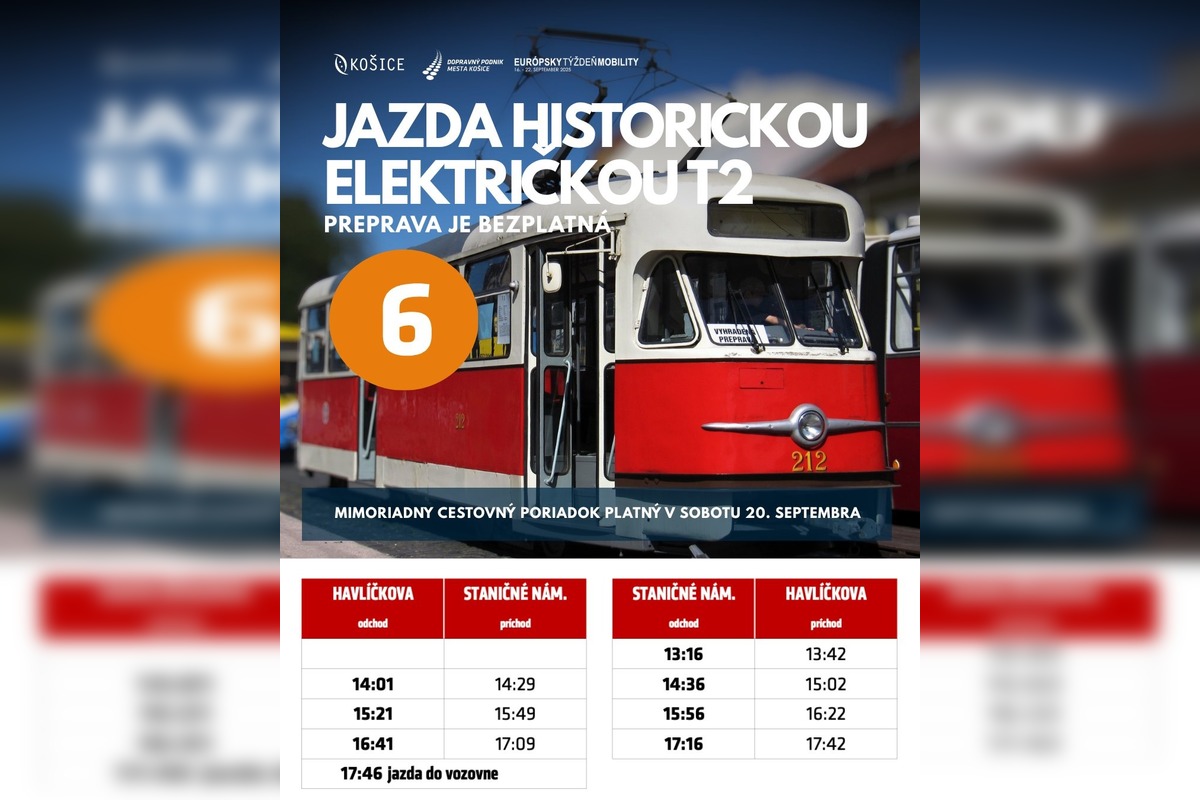 V sobotu sa záujemcovia môžu odviezť historickou električkou T2 po mimoriadnej linke 6, pričom jazda bude pre všetkých zdarma. Trasa povedie od Havlíčkovej cez Námestie Maratónu mieru, Novú nemocnicu, SOŠ Automobilovú, Námestie osloboditeľov až na Staničné námestie a späť.