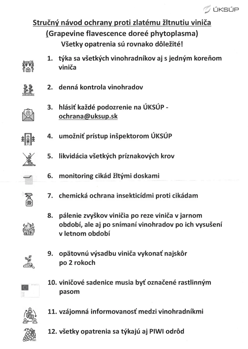 Opatrenia sa týkajú aj monitorovania hlavného prenášača choroby – cikádky Scaphoideus titanus. Vinič musí byť minimálne dvakrát postriekaný proti tomuto škodcovi. Zakázané je aj využívanie ošetrených listov na potravinárske účely. Nové výsadby budú povolené až po dvoch rokoch pestovania inej plodiny, ktorá nie je hostiteľom zlatého žltnutia viniča.