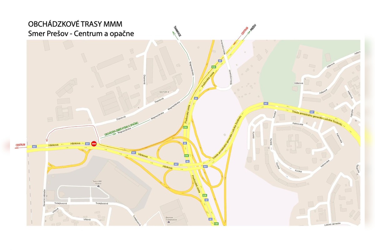 Z diaľnice od Prešova sa autom dá dostať po odbočenie do Tesca a mestskej časti Džungľa. Po ulici Rampovej cez železničné priecestie je umožnený príjazd do širšieho centra mesta (platí aj pre opačný smer). Vozidlá prichádzajúce po Palackého ulici do centra budú odklonené smerom k železničnej stanici. Bočnými ulicami cez Svätoplukovu ulicu – Alvinczyho – Alešovo nábrežie – Odborársku ulicu je možné sa autom dostať až na Študentskú ulicu a následne pokračovať po Hlinkovej v smere Tesco, Prešov, Dargovských hrdinov.
