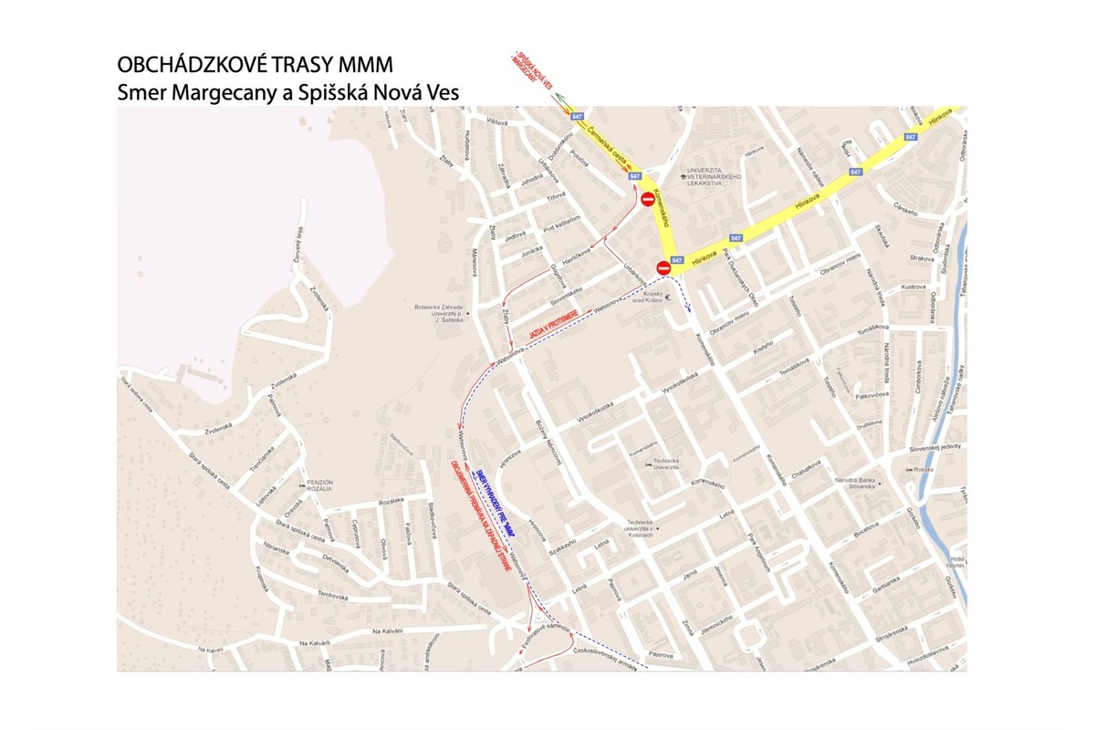 Z Triedy SNP pred Festivalovým námestím je umožnený prejazd do protismeru cez koľajište v smere na ulicu Watsonovu. Watsonova ulica je rozdelená dopravnými kužeľmi. Jazdné pruhy smerom ku Komenského ulici sú vyhradené pre bežcov. Na opačnej strane bude obojsmerná premávka po Hurbanovu ulicu. Odbočením na ulicu Ferka Urbánka sa vozidlá dostanú z mesta od/do Čermeľa, na Podhradovú a v smere na Margecany a Spišskú Novú Ves.