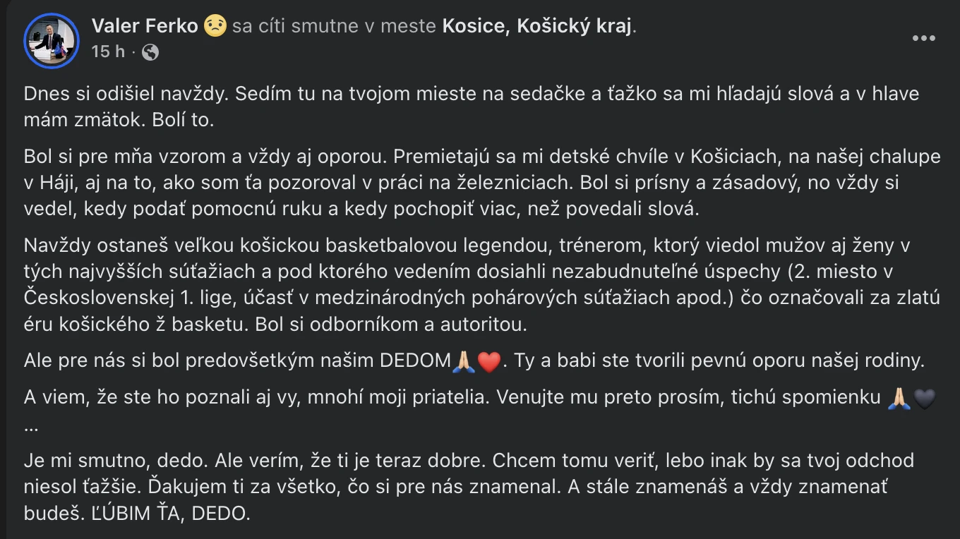 Jeho vnuk, politik Valér Ferko sa s dedkom rozlúčil emotívnymi slovami na sociálnej sieti. „Bol si pre mňa vzorom a vždy aj oporou. Premietajú sa mi detské chvíle v Košiciach, na našej chalupe v Háji, aj na to, ako som ťa pozoroval v práci na železniciach. Bol si prísny a zásadový, no vždy si vedel, kedy podať pomocnú ruku a kedy pochopiť viac, než povedali slová,“ napísal v príspevku.