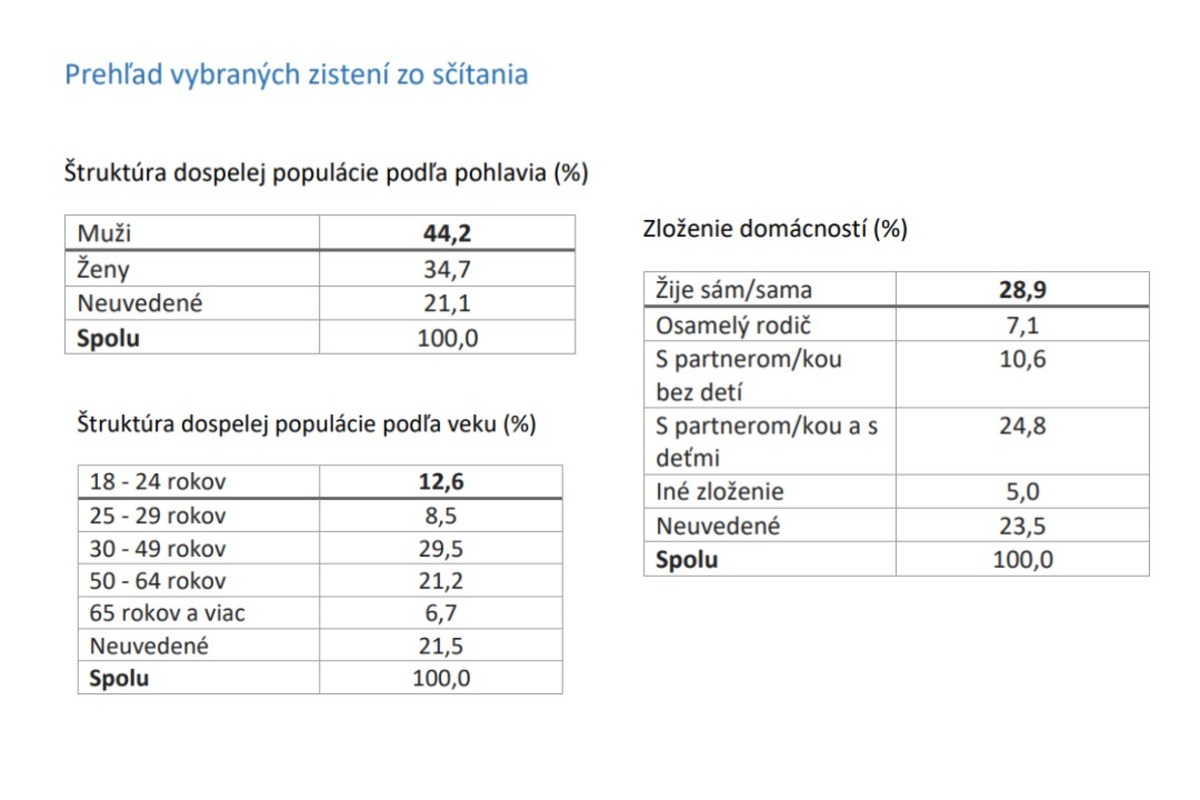 Medzi ľuďmi bez domova majú najväčšie zastúpenie muži (44,2 %), avšak 21 % opýtaných ani neudalo svoje pohlavie. Čo sa týka veku, išlo prevažne o strednú generáciu, teda osoby od 30 od 49 rokov (29,5 %). Prevládali jednotlivci, ktorí žijú sami, teda bez partnera a detí (28, 9%), štvrtina sčítaných spolunažíva s partnerom a deťmi. Niečo vyše 7 % tvorili osamelí rodičia.