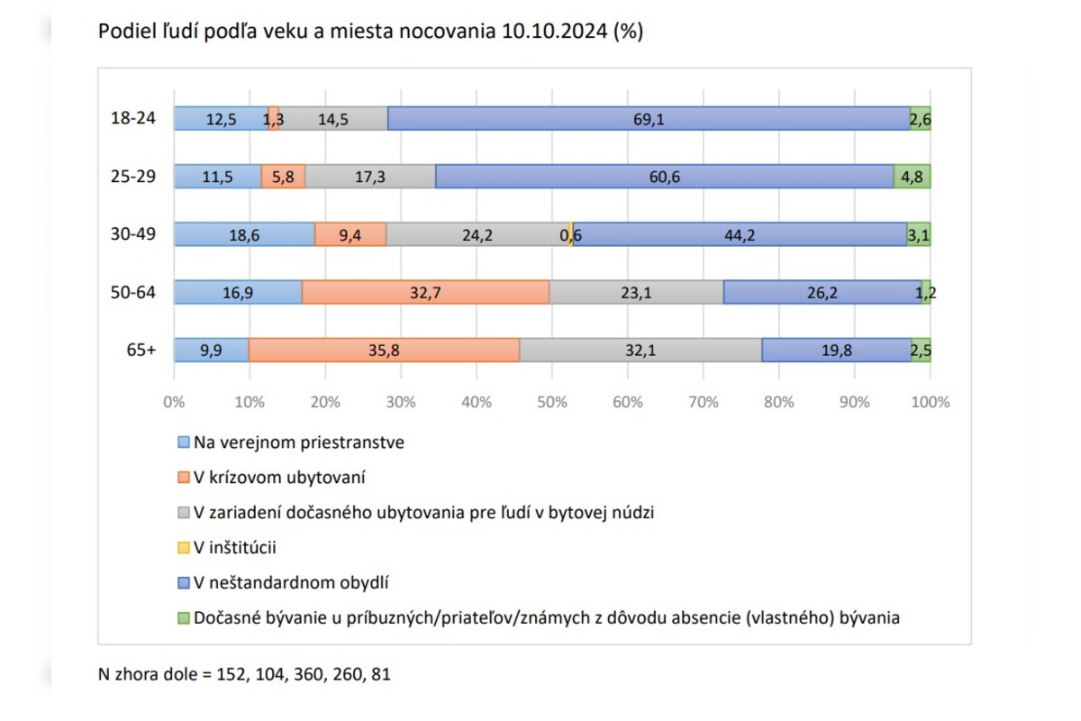 Z dát vyplýva, že len malá časť ľudí bez domova prespáva priamo na ulici – približne 150 osôb, teda menej ako 7 percent. Väčšina žije v neštandardných obydliach ako sú chatrče, záhradné chatky či prístrešky (43,1 %), alebo využíva služby útulkov a nocľahární.