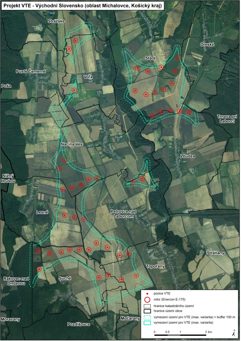 Podľa zámeru predloženého na posudzovanie vplyvov na životné prostredie (EIA) by sa turbíny mohli objaviť severne od mesta Michalovce v katastrálnych územiach obcí Lesné, Michalovce, Močarany, Nacina Ves, Oreské, Petrovce nad Laborcom, Pozdišovce, Pusté Čemerné, Rakovec nad Ondavou, Staré, Strážske, Suché, Topoľany, Trnava pri Laborci, Voľa a Zbudza.