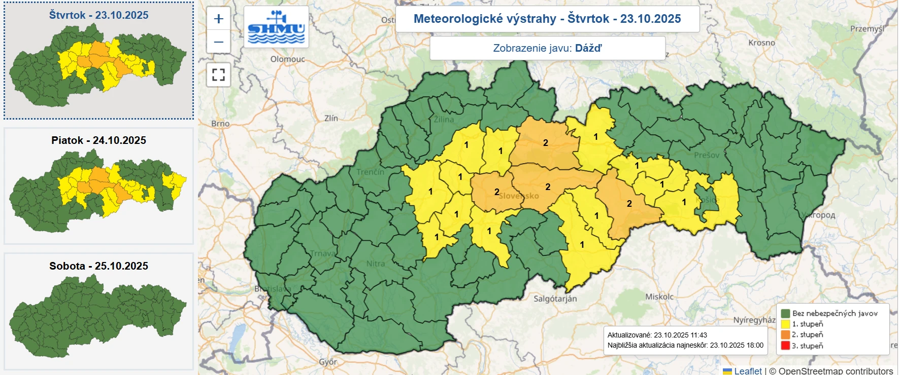 Najviac zrážok by malo padnúť počas štvrtkovej noci a piatkového skorého rána, a to medzi 20:00 a 08:00 hod. Prvostupňové výstrahy platia pre okresy Košice – okolie, Gelnica a Spišská Nová Ves. Zrážky viac potrápia Rožňavský okres, kde vyhlásili až druhý stupeň. Očakáva sa, že úhrn zrážok presiahne 50 milimetrov.