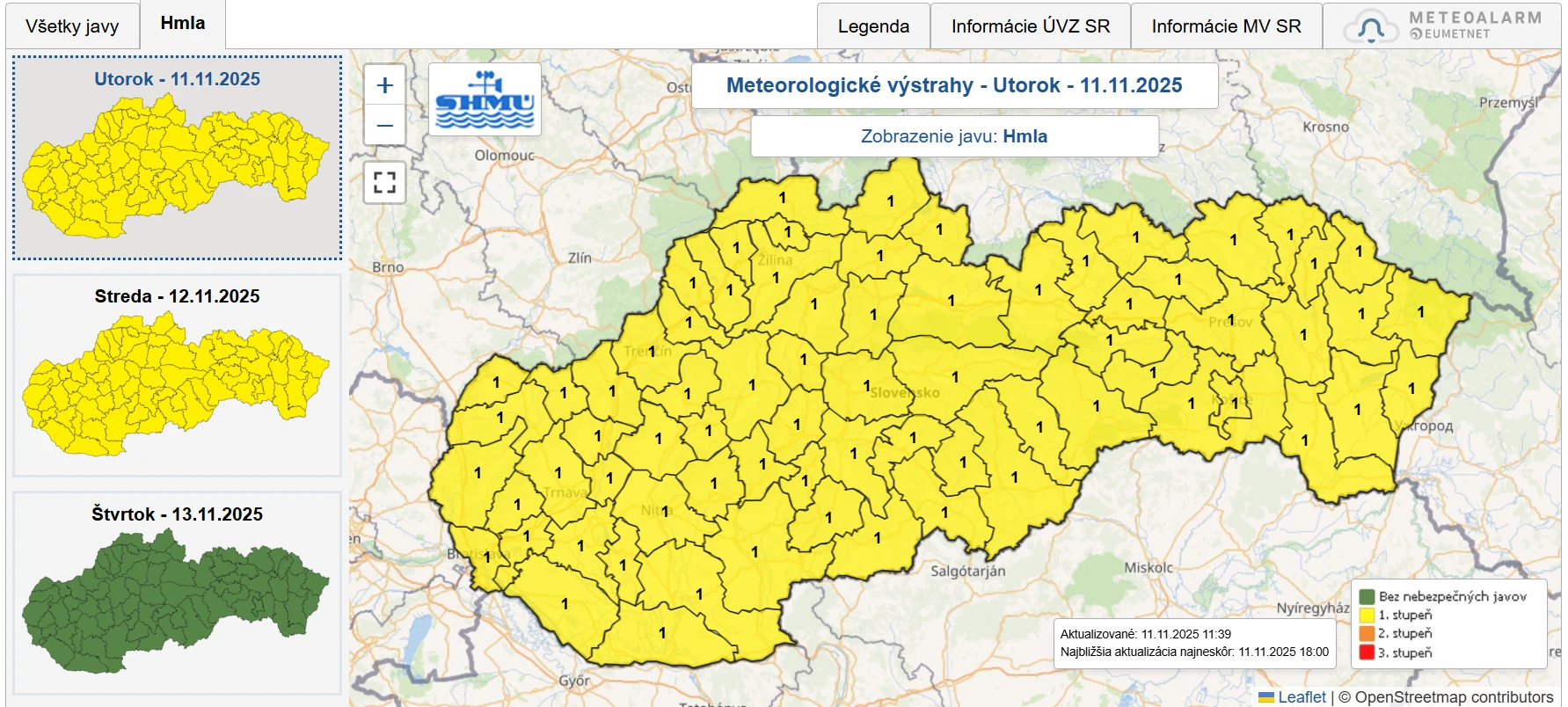 Slovenský hydrometeorologický ústav upozorňuje, že najkritickejšia bude noc a skoré ranné hodiny, keď sa husté hmly budú udržiavať dlhodobo a lokálne môžu byť ešte hustejšie. Takéto podmienky môžu spôsobiť zlé odhady vzdialeností či problémy udržať sa vo svojom jazdnom pruhu.
