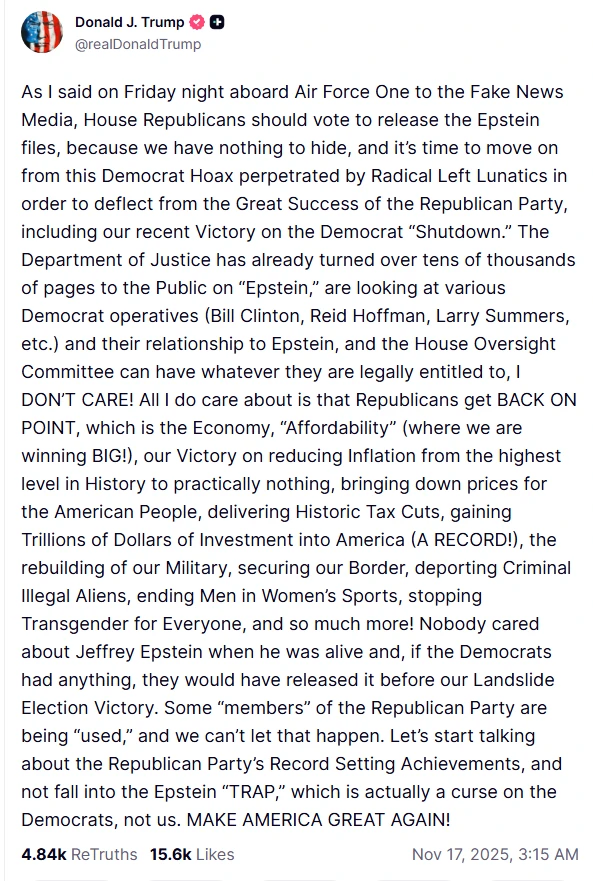 Prezident Donald Trump prekvapivo vyzval republikánov v Snemovni reprezentantov, aby zahlasovali za zverejnenie vyšetrovacích spisov týkajúcich sa zosnulého sexuálneho delikventa Jeffreya Epsteina, hoci doteraz bol striktne proti. Svoje rozhodnutie odôvodnil priamo na sociálnej sieti slovami: „Nemáme čo skrývať. Je mi to jedno! Jediné, na čom záleží, je, aby sa republikáni vrátili späť k hlavnej téme, ktorou je ekonomika,“ napísal.