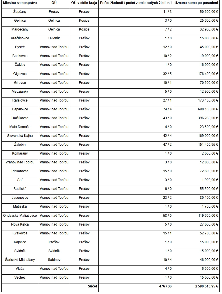 V zozname nájdeme desiatky obcí od Župčian a Gelnice, cez Bystré, Holčíkovce či Sedliská, až po Vechec. Dokopy bolo podaných 476 žiadostí, z toho 36 bolo zamietnutých. Najvyššie uznané sumy presiahli v niektorých obciach aj 600-tisíc eur.