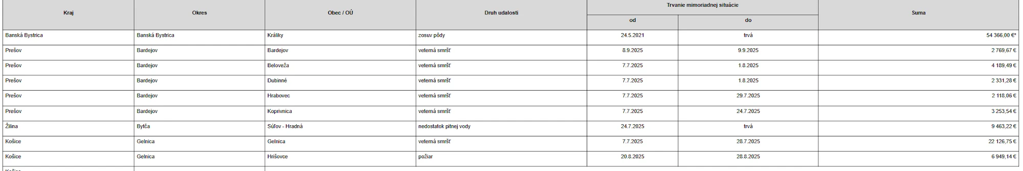 Všetky podklady opäť preverovali verifikačné komisie okresných úradov, ktoré následne kontrolovala sekcia krízového riadenia ministerstva vnútra. Výsledná suma preukázaných výdavkov je 381 355,20 eur. Z tabuľky vyplýva, že najvyššiu sumu, 54 366 eur, najnovšie dostane obec Králiky v okrese Banská Bystrica za zásahy po zosuve pôdy trvajúcom od roku 2021. Ďalšie položky pokrývajú obce z okresov Bardejov, Bytča, Gelnica či Poprad.
